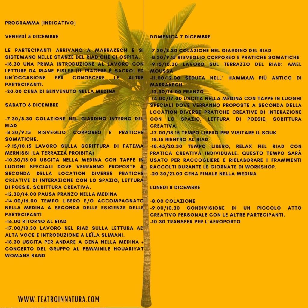 Proporremo la Lettura di autrici che hanno riscritto la geografia del corpo e la sua verità, esercizi di scrittura creativa, momenti di risveglio corporeo e pratiche somatiche, tra momenti di lavoro sul terrazzo panoramico del Riad dove soggiorneremo e tappe nei luoghi suggestivi della città.